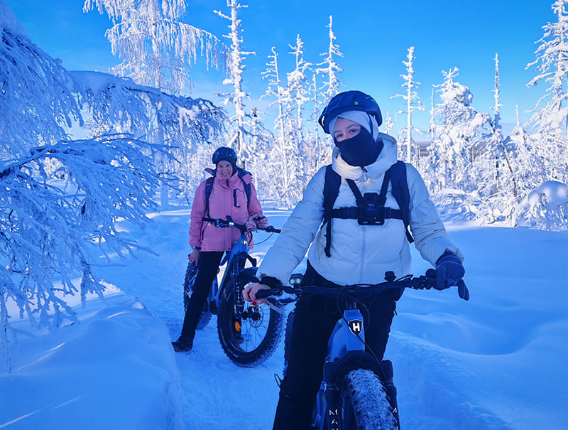 You’ll ride a Helkama FE12 electric fatbike, Finnish-made for Arctic terrain and equipped with a powerful 708Wh battery — making long distances and changing elevations feel effortless.