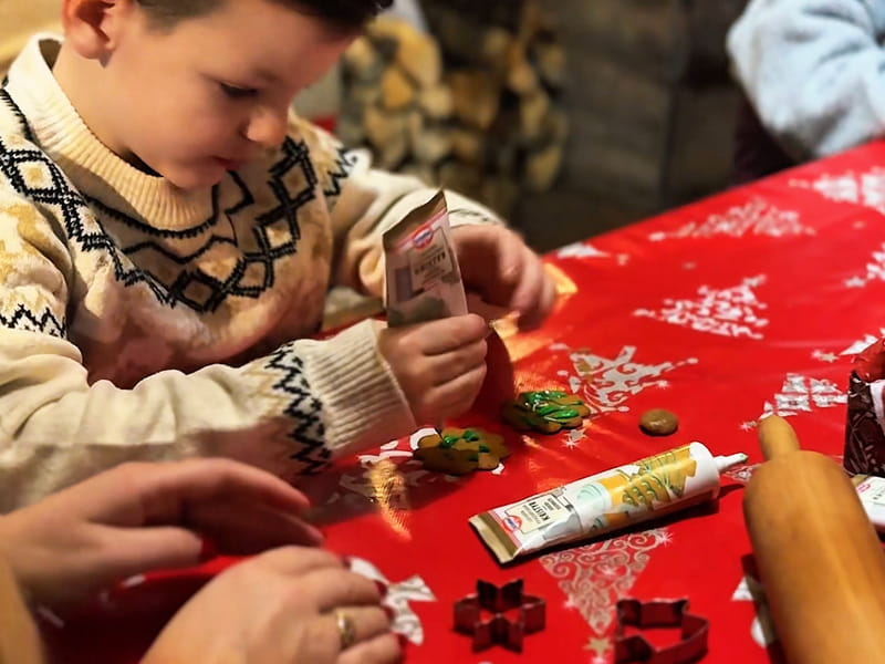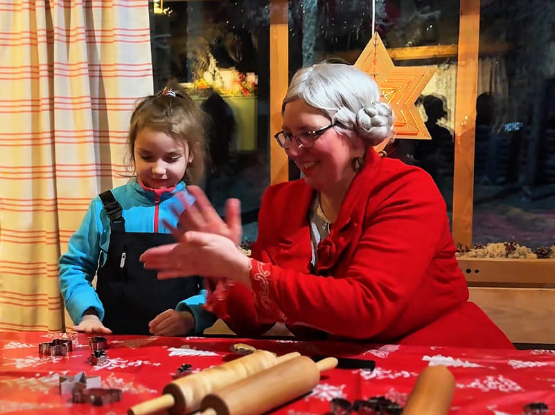 Le Père Noël a une cabane secrète où, avec son renne de tête Rudolf, il se repose de ses journées chargées. Ici, dans une atmosphère familiale et détendue, dans sa vieille cabane de Noël confortable, le Père Noël passe de longues soirées à rencontrer ses bons amis du monde entier. Il n'y a jamais de file d'attente chez lui, car le programme est organisé exclusivement pour notre groupe. Heureusement, l'endroit est situé à 15 minutes du centre de Levi. La cabane secrète du Père Noël est un bâtiment historique datant de plus de 100 ans avec une ambiance unique. À l'intérieur de la maison, vous trouverez une ancienne station postale du Père Noël avec un tas de lettres d'enfants, une vieille chaise à bascule du Père Noël, de belles décorations de Noël, y compris le sapin de Noël et de nombreux objets historiques du mode de vie finlandais et lapon. À l'extérieur de la cabane, le Père Noël gare son traîneau magique avec le renne Rudolf. Vous pouvez prendre autant de photos que vous le souhaitez avec le Père Noël pour des souvenirs inoubliables. À votre arrivée, vous serez accueillis par le Père Noël avec son renne Rudolf et son elfe assistant, qui invitera tout le monde à entrer dans la cabane. Plus d'une heure d'interaction en direct avec le Père Noël (avec son elfe assistant et Missis Claus) : chaque famille a la possibilité de passer suffisamment de temps avec le Père Noël, de partager ses souhaits secrets en face à face, d'écouter l'histoire de Noël du Père Noël, de chanter ensemble des chansons de Noël et d'en apprendre davantage sur le Noël traditionnel finlandais. Vous serez assis autour d'un poêle à feu crépitant et écouterez le Père Noël raconter une histoire de Noël. Chaque enfant a la possibilité de parler en privé avec le Père Noël, de s'asseoir sur ses genoux, de toucher sa barbe, de murmurer ses propres vœux secrets pour Noël et, bien sûr, de recevoir enfin un cadeau. S'asseoir sur les genoux du Père Noël est un privilège spécial, alors ne soyez pas surpris que même les adultes aiment le faire. Ensuite, tous les invités avec le Père Noël chanteront ensemble une chanson de Noël. Il sera temps pour l'atelier de pain d'épices pour les enfants et la famille avec la Mère Noël (en finnois « Muori »). Vos enfants apprendront à faire de vrais pains d'épices de Noël à partir de la confection de la pâte, à les cuire et à les décorer. L'elfe emballera vos pains d'épices afin que vous puissiez les emporter chez vous ou les manger sur place, en sirotant une boisson traditionnelle finlandaise à base de vin chaud de Noël, appelée « glöggi » (sans alcool).